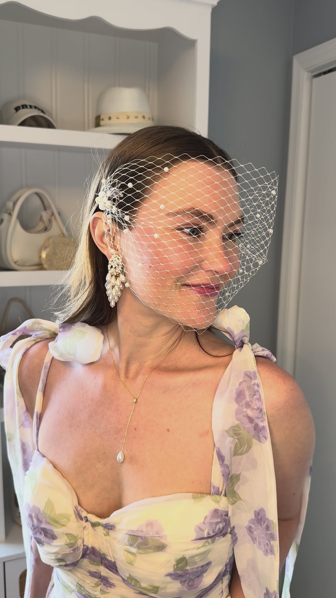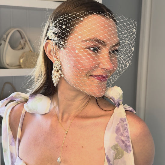 A nod to vintage glamour with a modern twist. This short birdcage veil clips in effortlessly with two pearl-accented bobby pins, adding soft mystery and elegant sparkle to your look. Perfect for brides who want a hint of drama without covering the whole face ~ timeless, delicate, and just a little flirty.