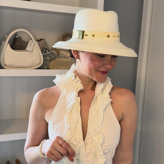 Cool, chic, and totally “it-girl.” This white beach hat features a vintage-inspired clasp on the side for a subtle, stylish twist. Perfect for sunny strolls, seaside selfies, or sipping cocktails by the waves — effortlessly elevates any beach day look with a touch of vintage charm.