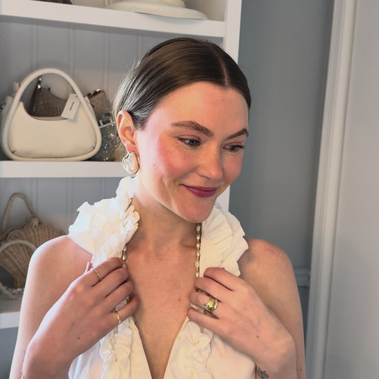 Make a statement with these stunning Baroque Pearl Earrings, featuring a uniquely shaped pearl framed in a delicate gold outline. Each earring is one-of-a-kind, adding an organic, modern touch to any outfit. Lightweight yet eye-catching, they’re perfect for brides, bridesmaids, or anyone looking to elevate their accessory game with a blend of elegance and contemporary flair.