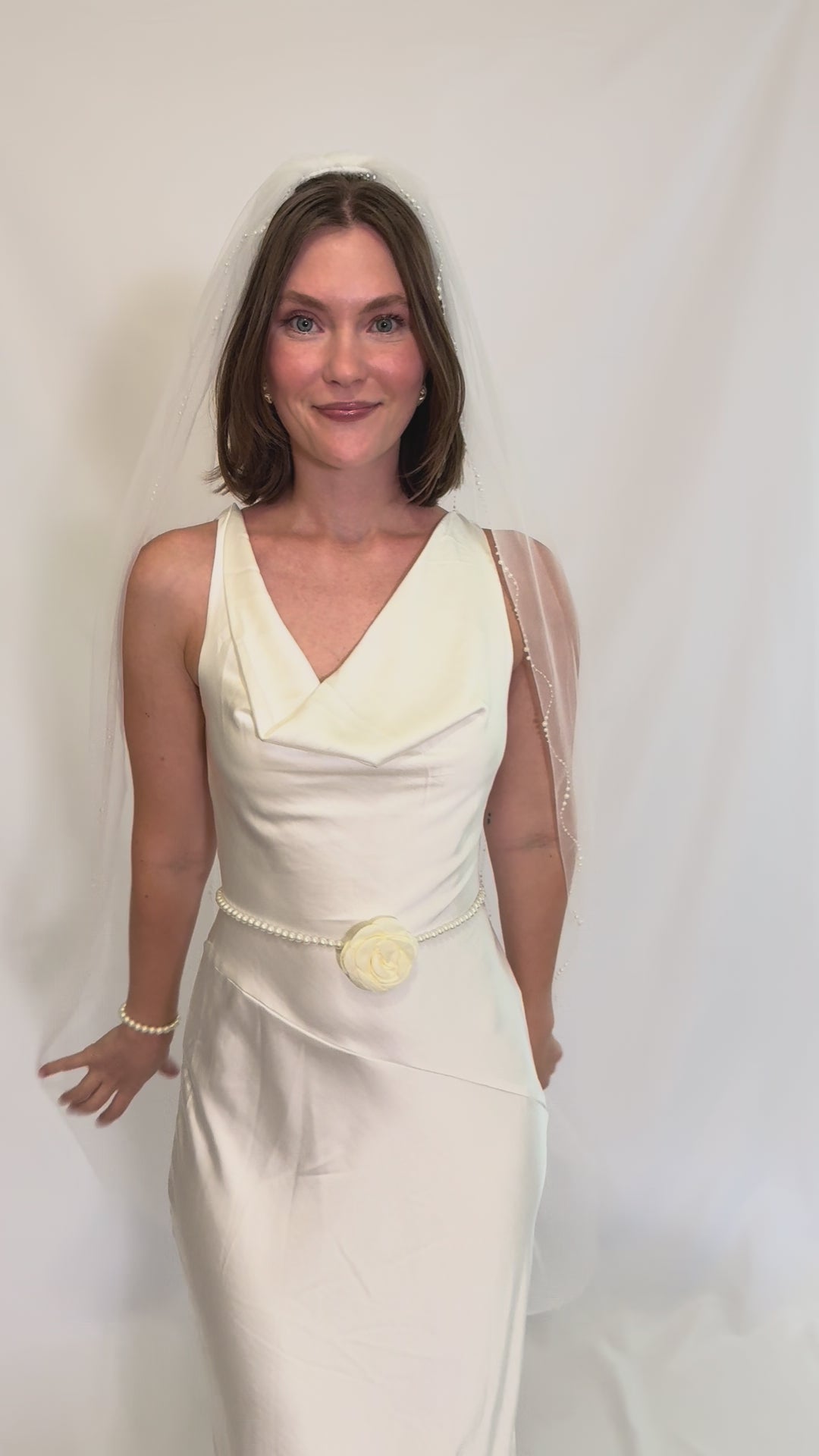 Pearls, but make them playful. This mid-thigh veil is strung with delicate squiggly strands of pearls that shimmer with every step, adding just the right amount of whimsy to your bridal look. Perfect for the minimalist bride who wants an elevated twist — or the pearl-obsessed bride who knows there’s no such thing as too many pearls.